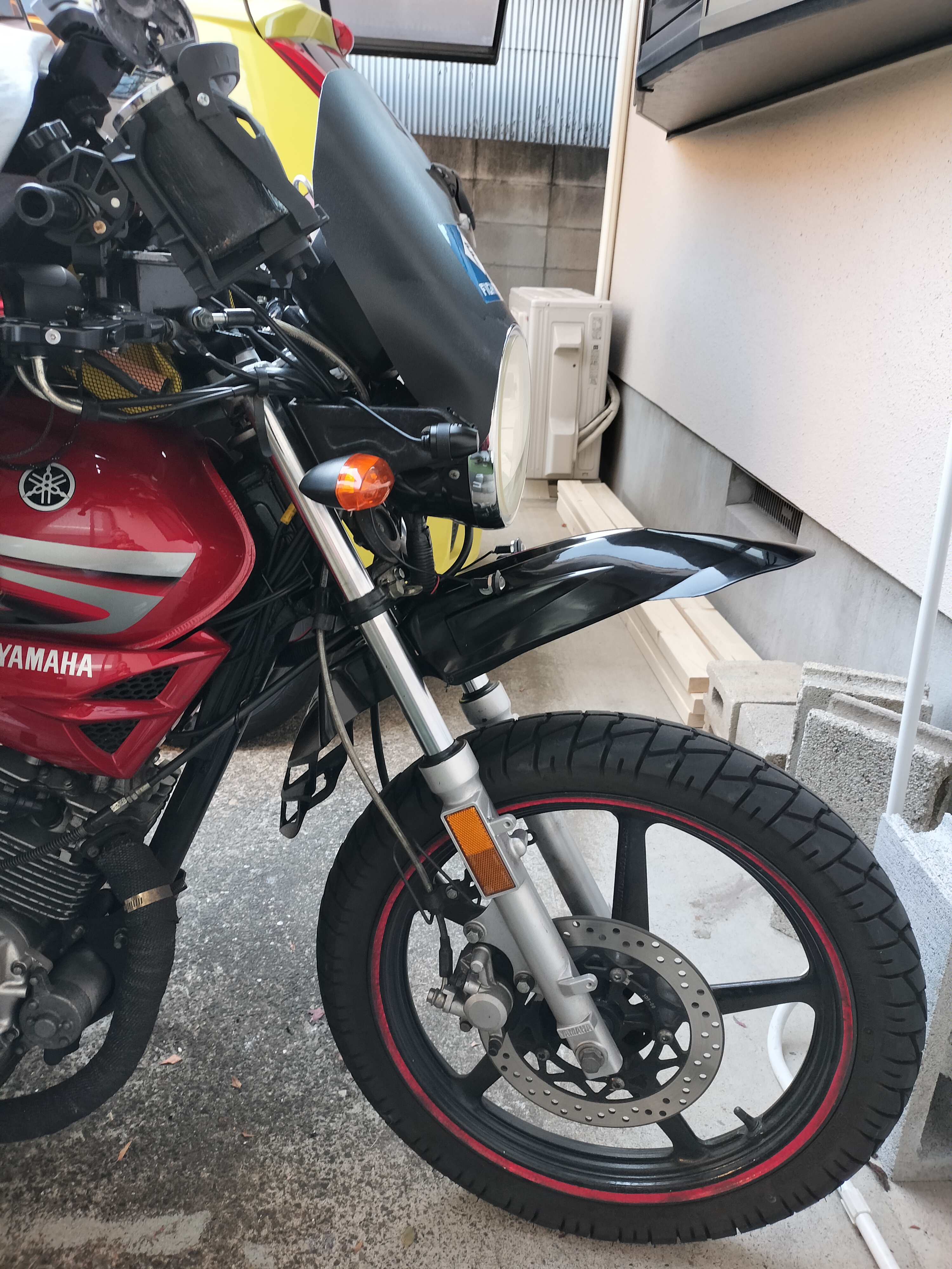 YBR125にはG型というちょっとだけオフロード仕様なものもあって、なんかそれっぽくなるしいいかって感じ。タイヤがオンロードタイヤなので、モタードっぽくもある。ある?