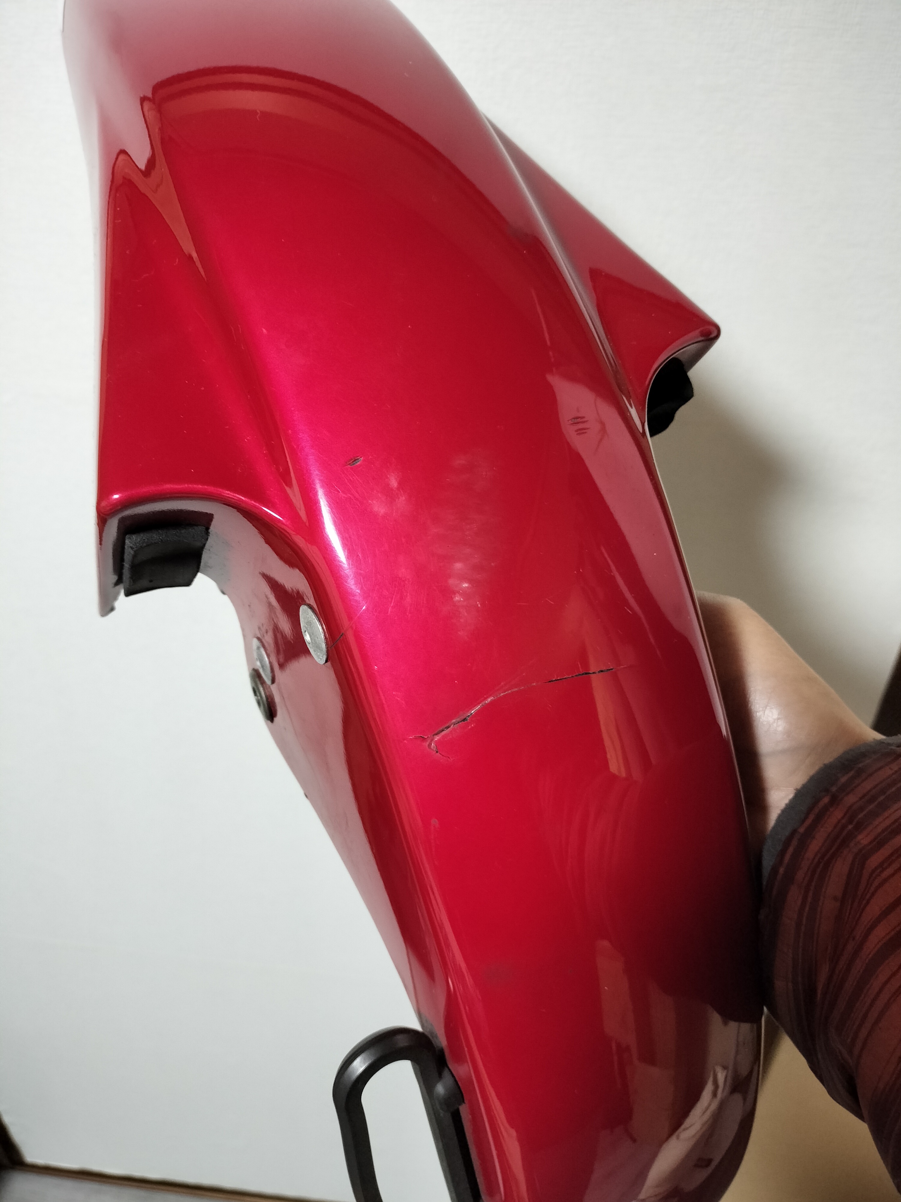 で、それで乗っていて特に問題はなかったのだけど、フロントフォークを交換してしばらく経ったとき、フロントフェンダーに割れが発生していることに気づいた。