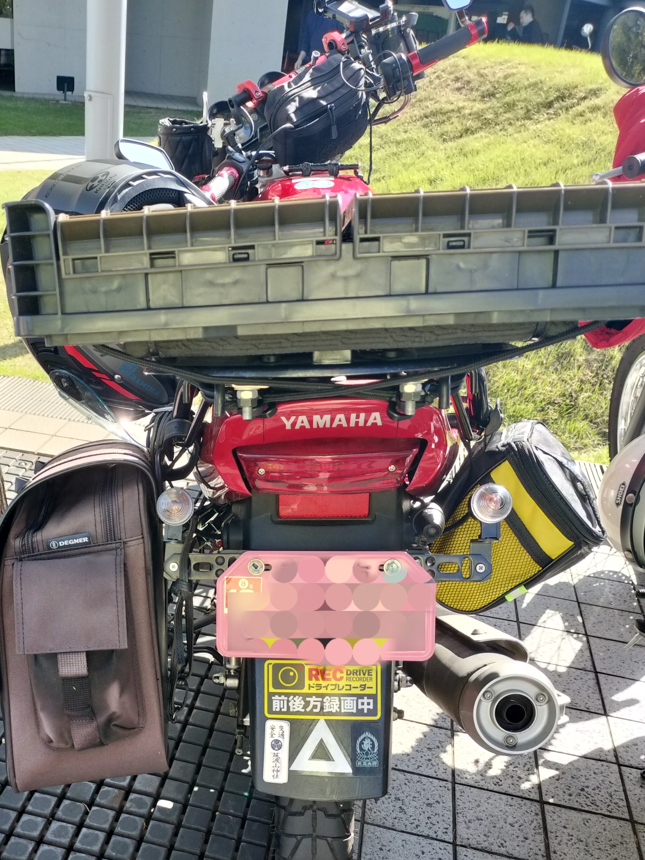 トップケースは取り外し、こんな感じの折りたたみコンテナをリアキャリアに固定している。使わないときは折りたたんでおくと、ちょっと見た目スッキリ。
