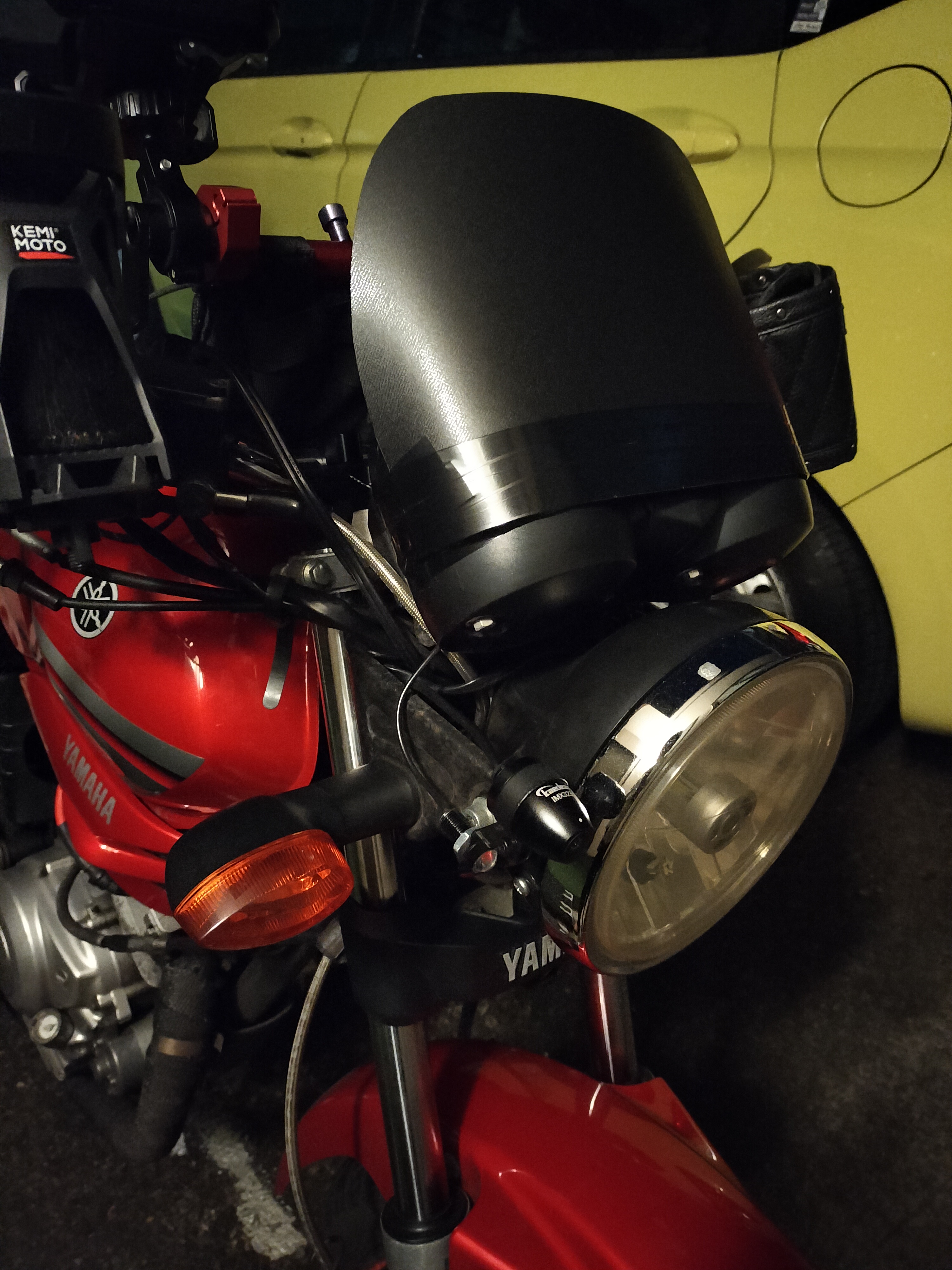 今現在うちのYBRくんには補助灯とかドラレコのカメラとか付けている関係で、ヘッドライトステーに既存のボルトで固定するのはちょっと無理。